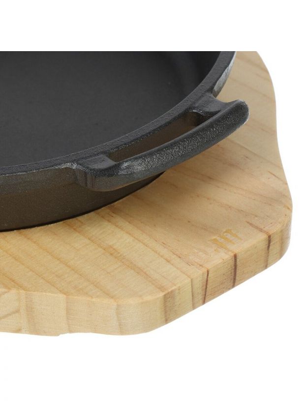 - Бамбуковая подставка защищает стол, а универсальность делает сковороду отличным подарком для дома или дачи.