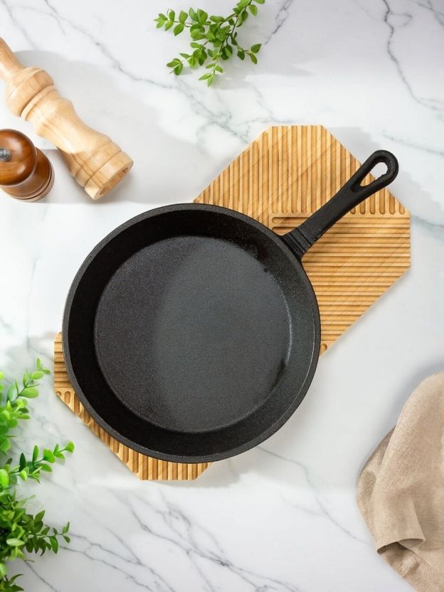 Как использовать чугунную сковороду? Перед первым применением её достаточно прокалить и смазать маслом — это создаёт натуральный антипригарный слой. Сковорода не боится металлических лопаток, устойчива к царапинам, не содержит вредных покрытий и безопасна для здоровья.