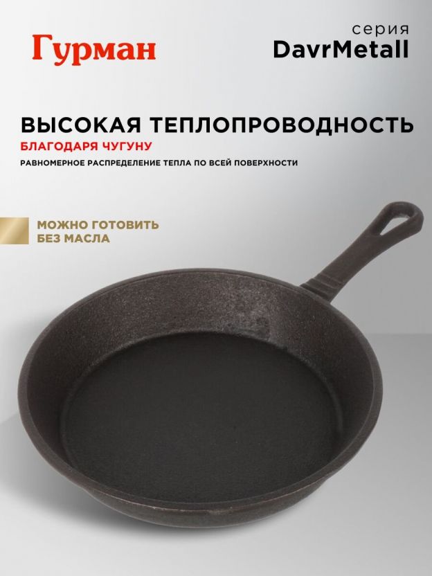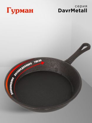 Сковорода чугун, 22 см, Гурман, DavrMetall, с литой ручкой, индукция