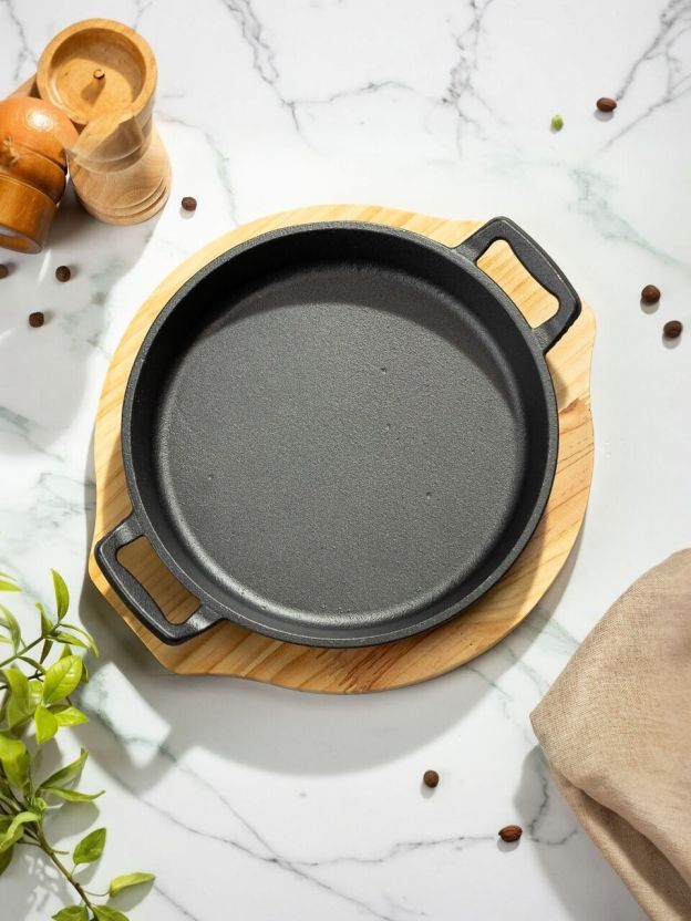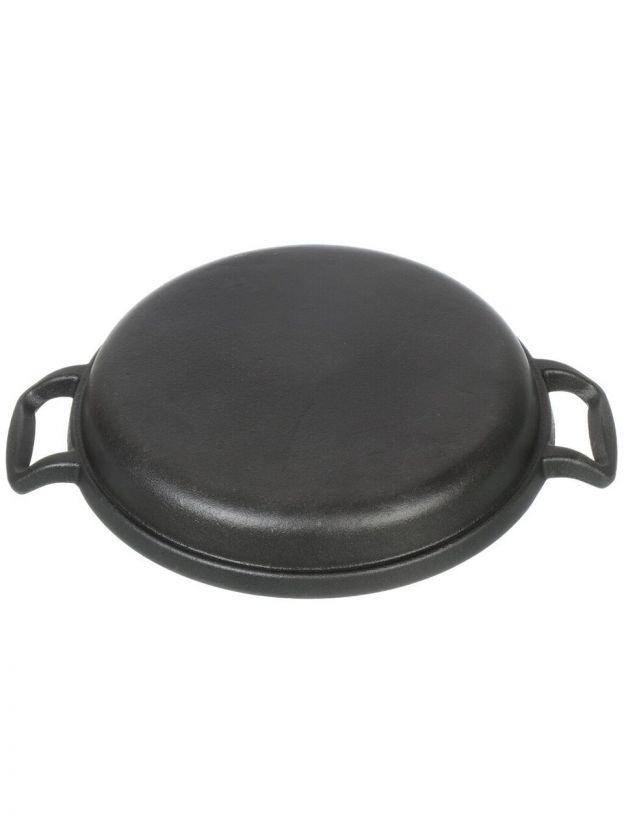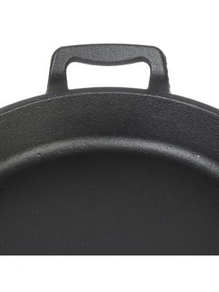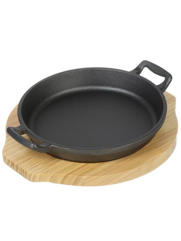 Как выбрать чугунную сковороду для дачи или дома? Эта модель подойдет для газовых, электрических, стеклокерамических, галогеновых плит, духовки и открытого огня (но не для индукции). В отличие от аналогов с искусственным покрытием, здесь нет риска выделения вредных веществ при перегреве. Бамбуковая подставка защищает столешницу и делает подачу блюда эстетичной — отличный вариант для семейных ужинов и подарка.