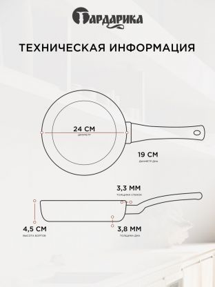 Диаметр сковороды — 24 см, диаметр дна — 19 см, высота борта — 45 мм. Это универсальный размер для приготовления разнообразных блюд на семью из 2-4 человек.
