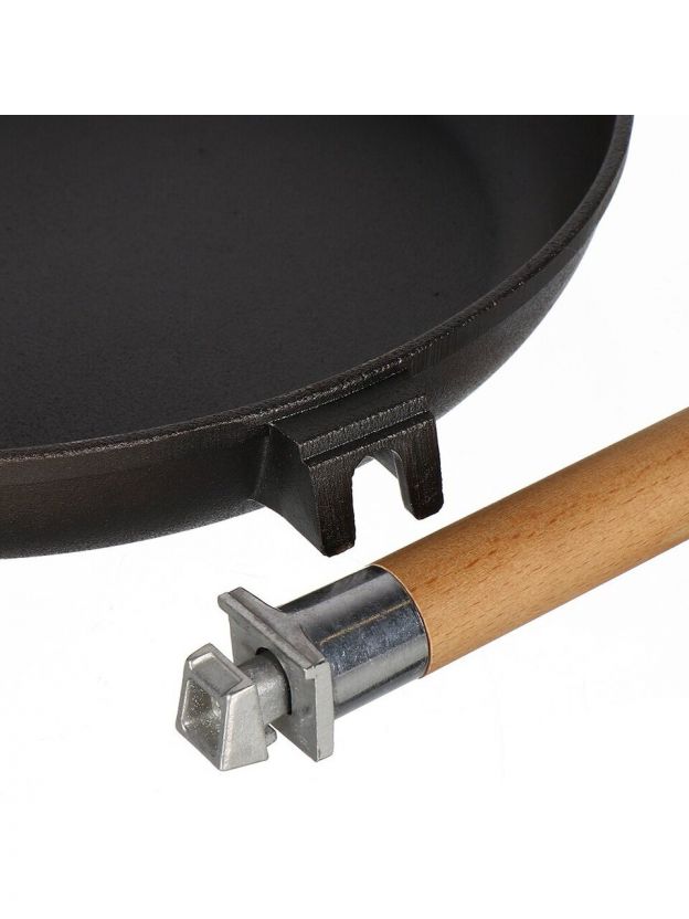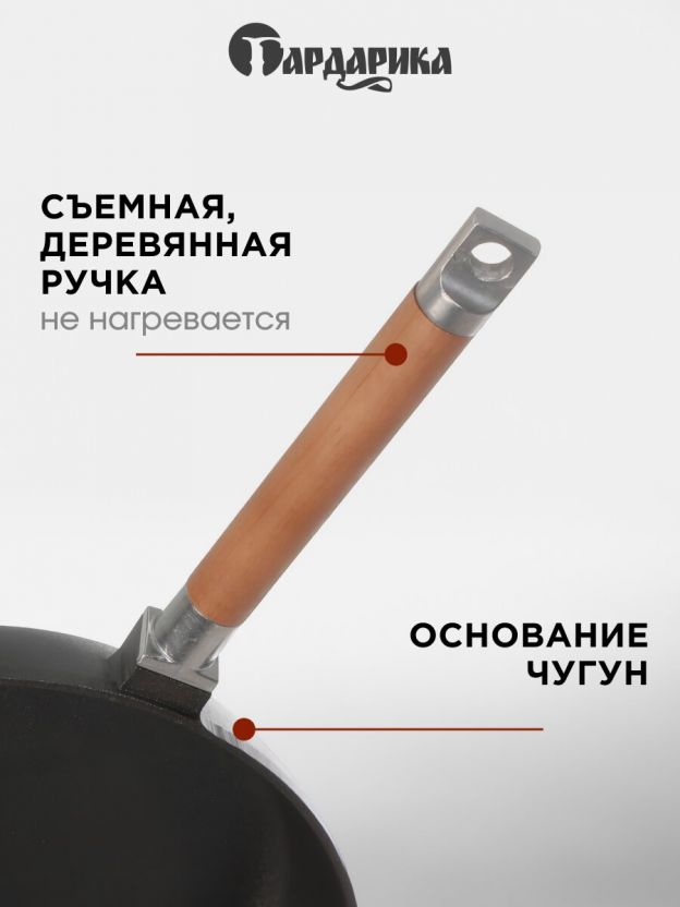 Съемная деревянная ручка позволяет использовать сковороду не только на плите, но и в духовке, брать на природу или компактно хранить. Это удобно для жарки, запекания и транспортировки.