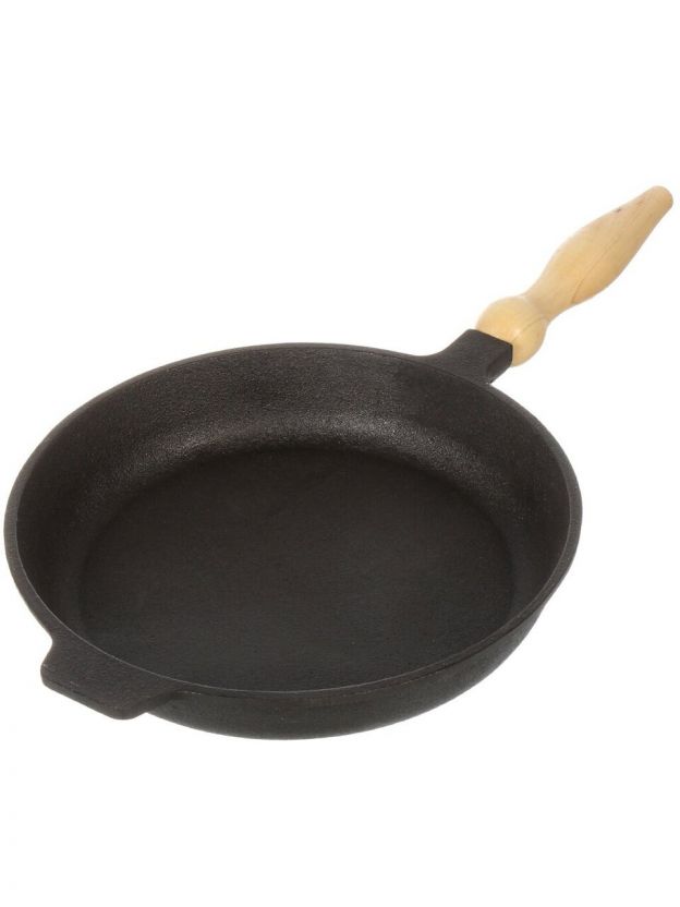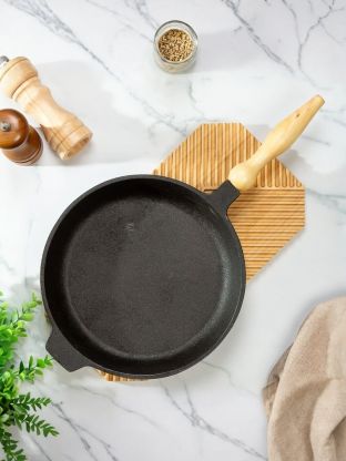 - Оптимальный размер 24 см, толстое дно 5 мм и чугун без покрытия — для равномерного прогрева и долговечности