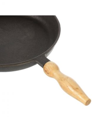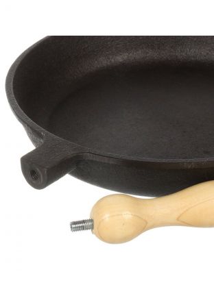 Съемная ручка позволяет использовать сковороду в духовке и экономить место при хранении. Натуральное дерево удобно лежит в руке и не нагревается во время готовки на плите.