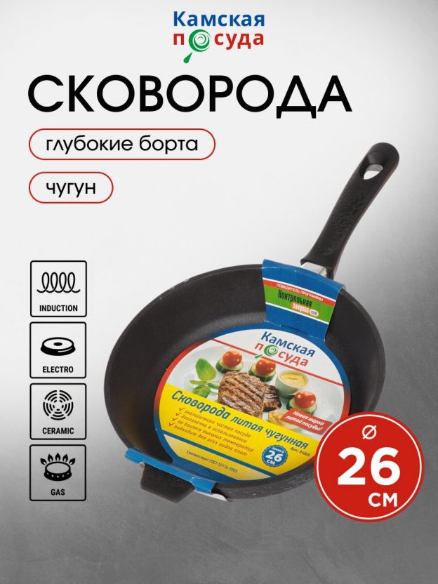 Чугунная сковорода 26 см Камская посуда: идеальный выбор для индукции, долгого жарения и здорового питания — без покрытия, для мяса, рыбы и выпечки