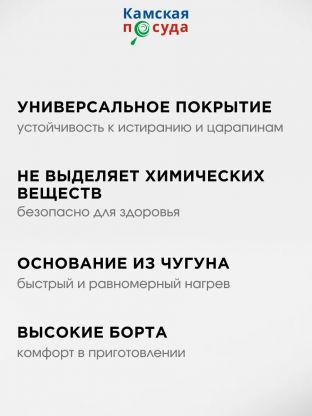 Выбирайте чугунную сковороду Камская посуда — это выгодно: гарантия 12 месяцев, российский производитель, быстрая доставка. Закажите сейчас и готовьте вкусно каждый день!