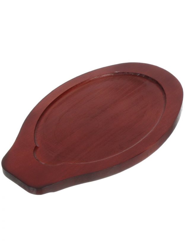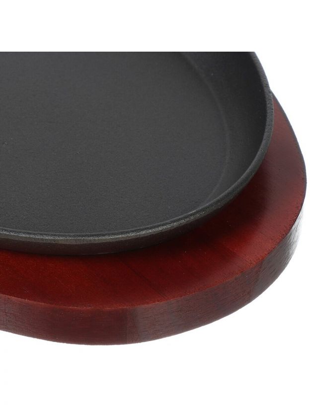 Овальная форма, габариты 26х18.5х2 см, диаметр дна 22 см, высота борта 20 мм, толщина дна 3 мм, стенок — 2 мм. В комплекте деревянная подставка.