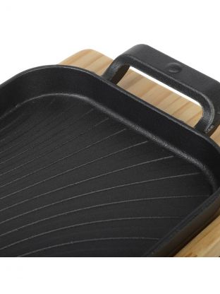 Чугунная сковорода 29х17 см с бамбуковой подставкой: идеальный выбор для мяса, рыбы и курицы дома и на даче. Натуральный чугун, рифленое дно, долговечность. Размеры с ручками - 35.7х17х2.5 см.