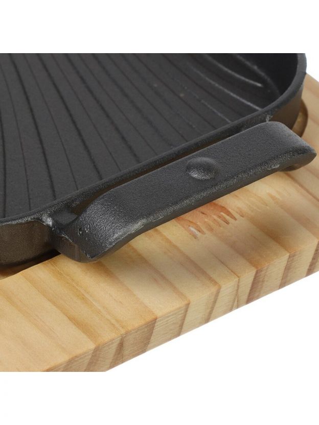 Если вы ищете, какую сковороду выбрать для дачи или для подачи мяса прямо на стол, обратите внимание на бамбуковую подставку — она защитит поверхность стола и добавит эстетики сервировке. В отличие от моделей с антипригарным покрытием, эта сковорода не боится металлических лопаток, а со временем приобретает натуральный антипригарный слой.