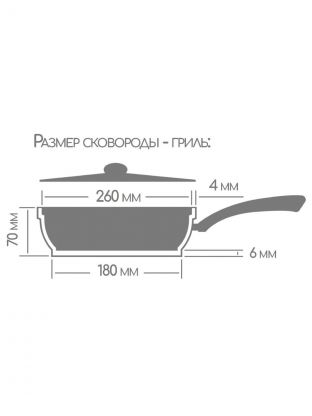 Диаметр 26 см и высота борта 70 мм позволяют готовить полноценные порции мяса, рыбы или овощей для 2-4 человек за один раз. Диаметр дна — 19 см.