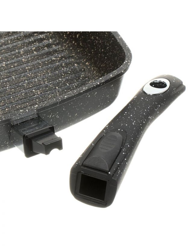 Литой алюминий, мраморное антипригарное покрытие, толстое дно 6 мм, квадратная форма, съемная ручка и срок службы 5 лет — идеальны для жарки без масла и легкой очистки.