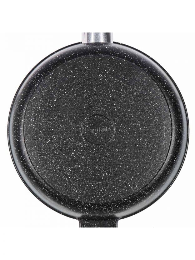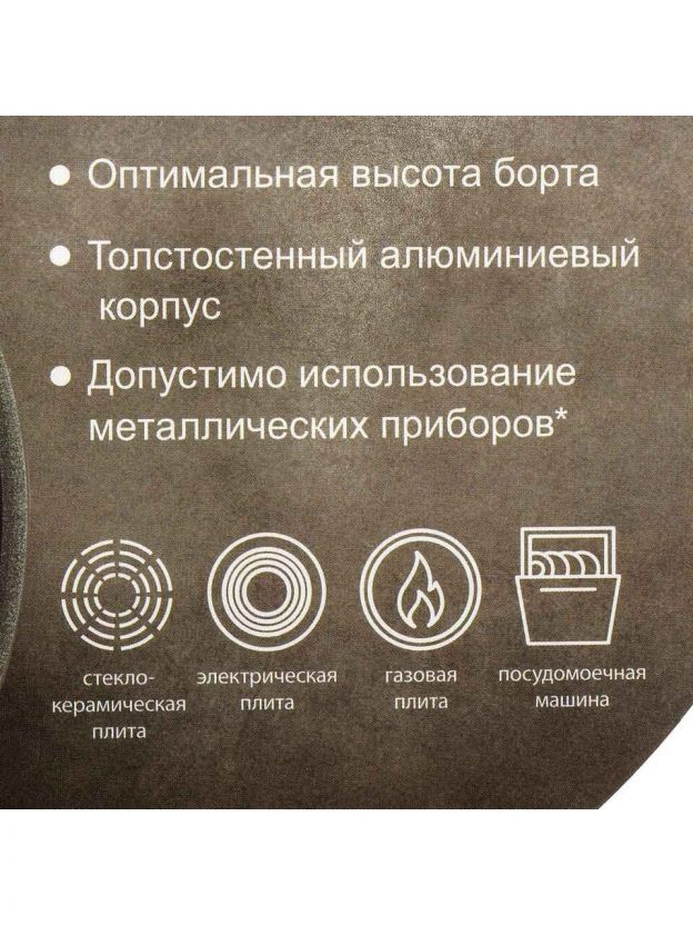 - Оптимальный диаметр 28 см, литой алюминий, толщина дна 6 мм — равномерный прогрев и срок службы до 5 лет