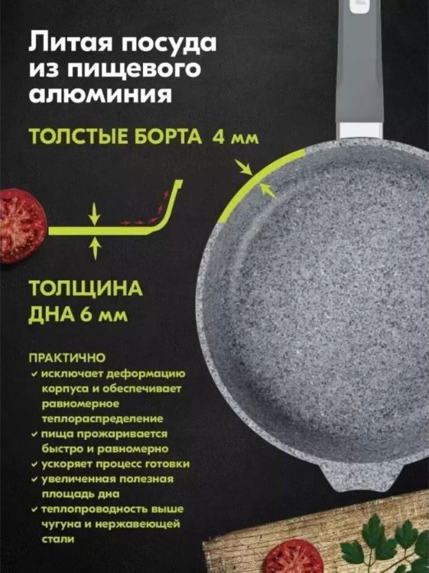 Сковорода из литого алюминия Мечта Premium grey 18 см — это идеальный выбор для тех, кто ищет компактную, но функциональную посуду для ежедневного приготовления. Гранитное антипригарное покрытие обеспечивает легкость в уходе: еда не прилипает даже при минимуме масла, а мытье в посудомоечной машине экономит время. Благодаря толщине дна 6 мм и стенок 4 мм, сковорода быстро прогревается и долго удерживает тепло, что особенно важно для равномерной прожарки мяса, рыбы или омлета.