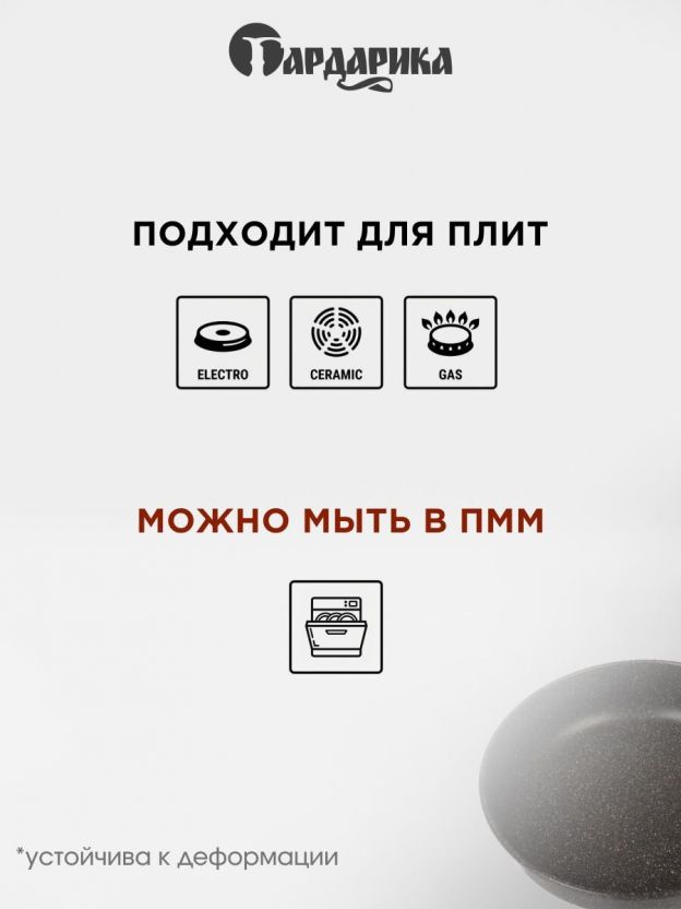 Нет, модель Гардарика Мегалит 18 22 см не подходит для индукционных плит. Совместима с газовыми, электрическими, стеклокерамическими и галогеновыми конфорками.