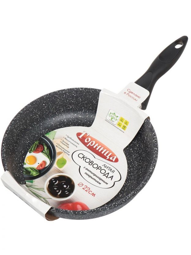 Сковорода из литого алюминия 22 см «Горница Гранит» — антипригарное покрытие, 6 мм дно, подходит для мяса, рыбы, яичницы. Долговечность — 5 лет гарантии.