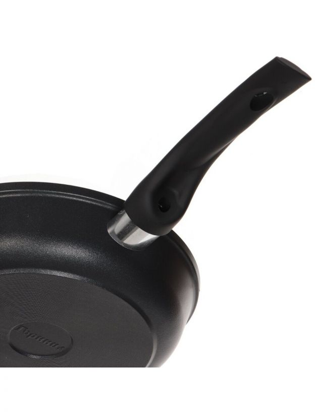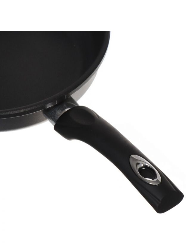 - Диаметр 22 см и антипригарное тефлоновое покрытие — удобно готовить рыбу, мясо, оладьи, омлеты