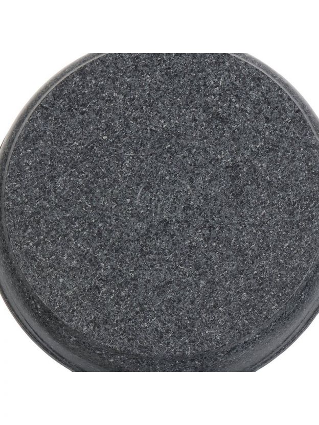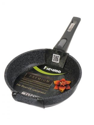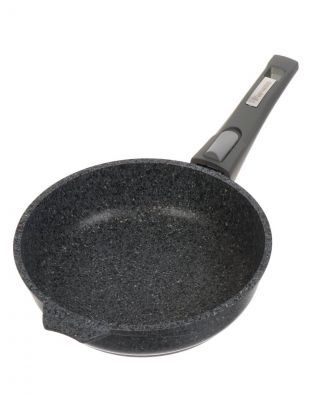 Сковорода выполнена из литого алюминия толщиной дна 6 мм и стенок 4 мм, что обеспечивает прочность и долгий срок службы. Антипригарное покрытие каменного типа устойчиво к царапинам и износу.