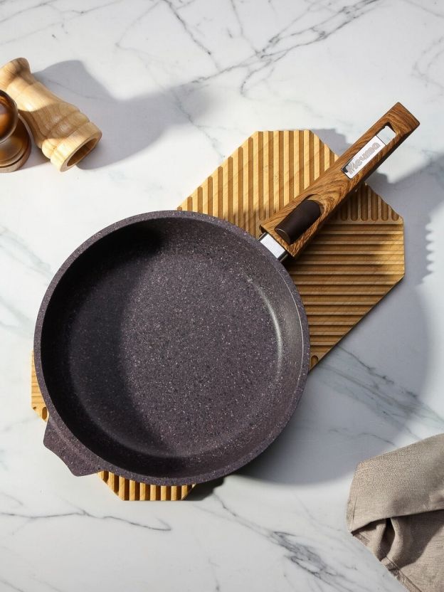 Сковорода из литого алюминия Мечта Premium violet с антипригарным покрытием — современное решение для тех, кто ищет, какую сковороду выбрать для ежедневного использования. Благодаря литой конструкции тепло распределяется равномерно, а прочное покрытие защищает от пригорания и облегчает уход. Съёмная ручка делает хранение компактным — удобно брать с собой на дачу или использовать в духовке.