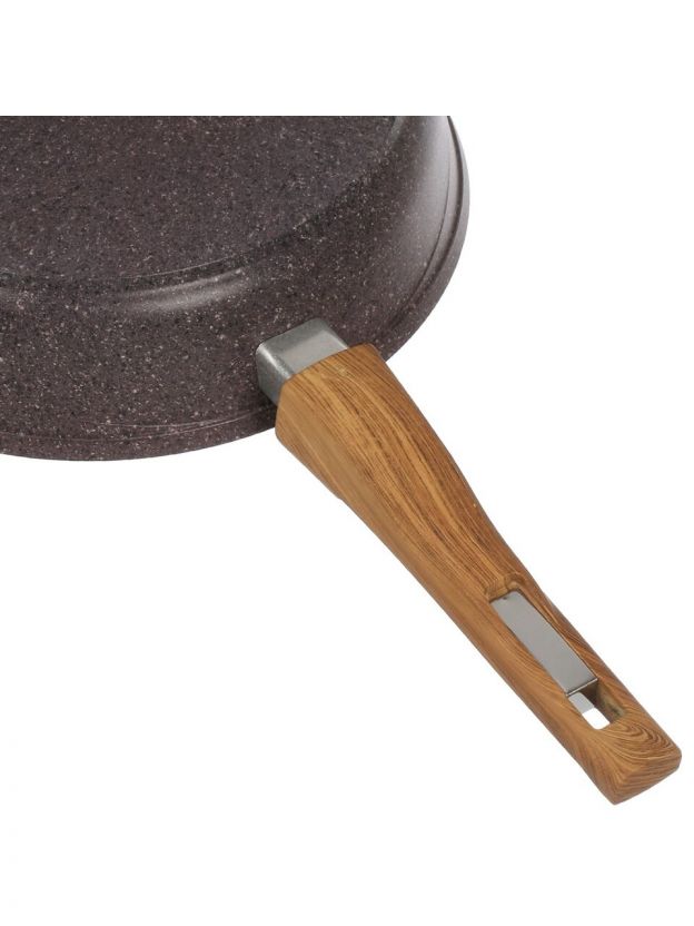 Диаметр 22 см, материал — литой алюминий с премиальным антипригарным покрытием, ручка съёмная для удобства хранения и использования.
