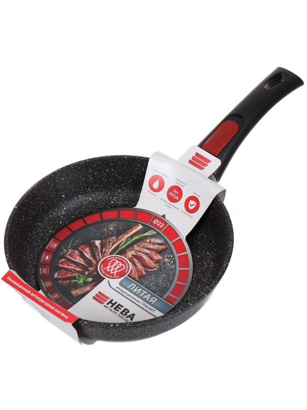 Сковорода Нева Металл Посуда Гранит 22 см: литой алюминий, съемная ручка, антипригарное покрытие, подходит для индукции – универсальное решение для дома и дачи.