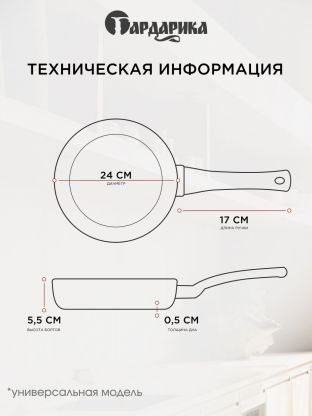 - Толстое дно 5 мм и литой алюминий — равномерный нагрев, долгий срок службы, оптимальный диаметр 24 см для семьи