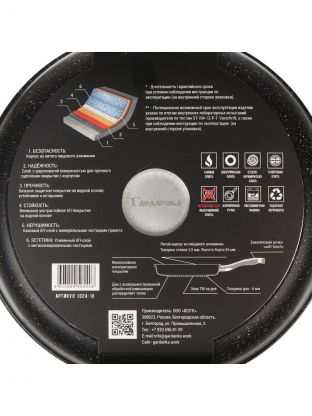 Диаметр 24 см (дно 18,8 см), литой алюминий с гранитным антипригарным покрытием, толщина дна — 5 мм, стенок — 3,5 мм.