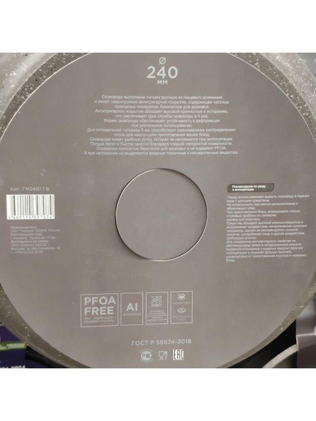 - Оптимальный диаметр 24 см, литой алюминий с толстым дном 4 мм — быстрый и равномерный нагрев, срок службы до 36 месяцев