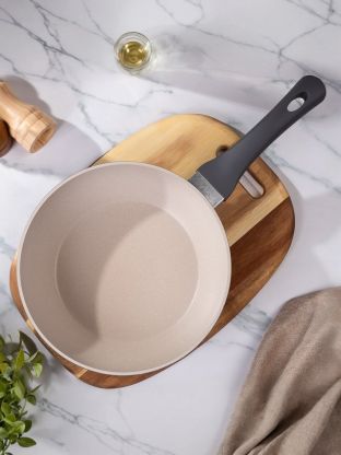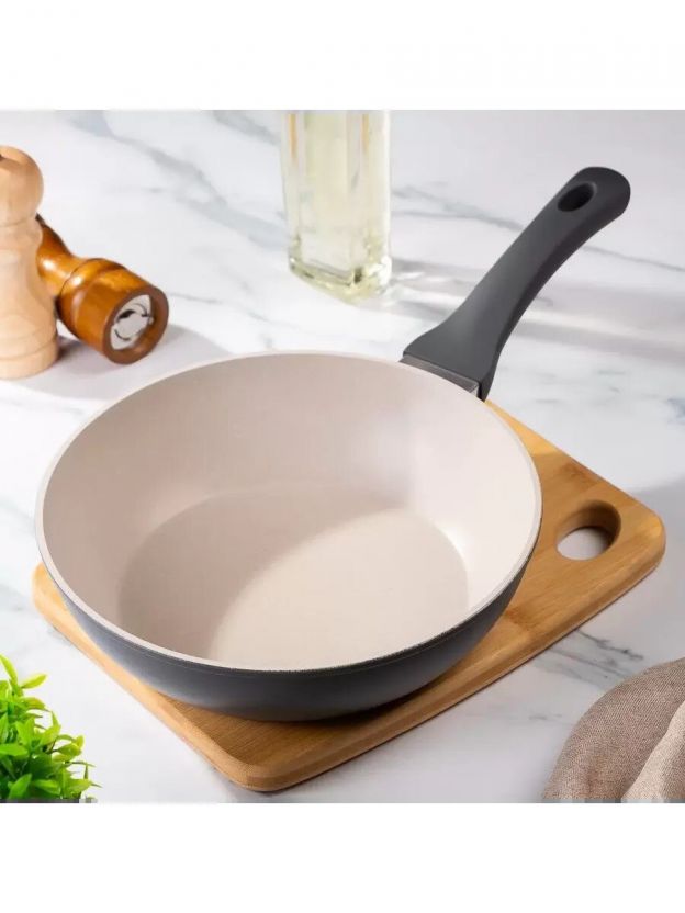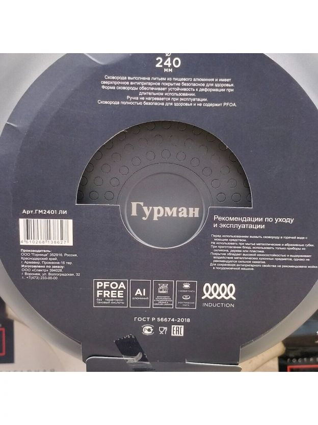 - Литой алюминий, диаметр 24 см, толщина дна 3,2 мм: равномерный нагрев, долговечность, гарантия 36 месяцев
