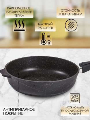 Чем отличается эта модель от обычных сковород? Увеличенная высота борта (60 мм) и прочность литого алюминия делают ее более долговечной и устойчивой к деформации. В отличие от тонких штампованных аналогов, гранитное покрытие не теряет свойств даже после многократного мытья в посудомоечной машине. Часто спрашивают: «Подходит ли для индукционной плиты?» — эта сковорода совместима с газовыми, электрическими, стеклокерамическими и галогеновыми плитами, но не с индукцией.
