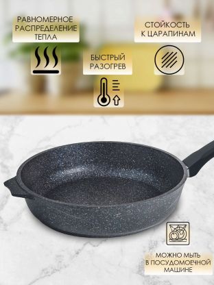 Сковорода Мечта Гранит star диаметром 24 см изготовлена из литого алюминия — это современный выбор для тех, кто ищет антипригарную сковороду для дома или дачи. Гранитное покрытие обеспечивает максимальную защиту от пригорания и позволяет готовить с минимальным количеством масла. Благодаря толщине дна 6 мм и стенок 4 мм, сковорода быстро и равномерно прогревается, что особенно важно для приготовления сочного мяса, рыбы или деликатных омлетов.