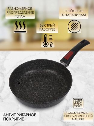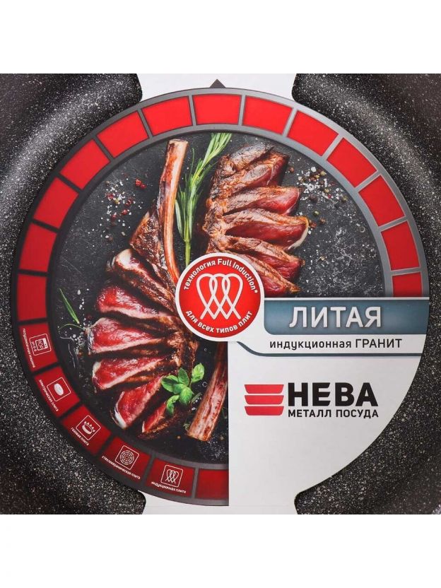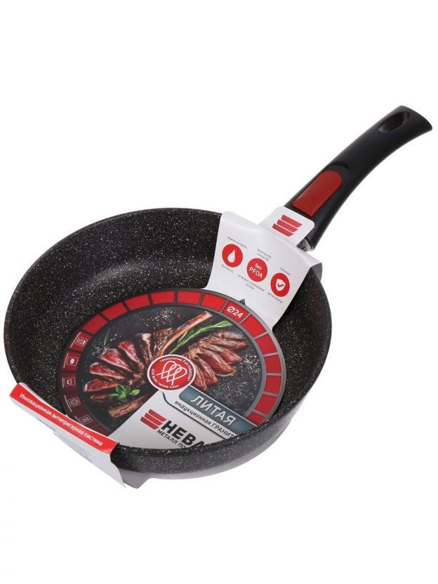 Сковорода Нева Металл Посуда Гранит 24 см — это универсальная посуда для индукционных, газовых, электрических и стеклокерамических плит. Литой алюминий обеспечивает долговечность, а гранитное антипригарное покрытие нового поколения гарантирует легкую очистку и отсутствие пригорания. Благодаря высокой теплоемкости и толщине дна 6,8 мм, сковорода равномерно прогревается, что особенно важно для жарки мяса, рыбы, курицы и приготовления омлетов.