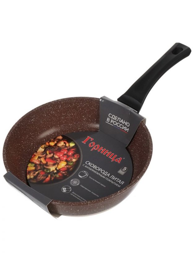 Сковорода из литого алюминия «Горница Шоколад» — это современное решение для тех, кто ищет, какую сковороду выбрать для ежедневного использования или подарка. Благодаря мраморному антипригарному покрытию блюда не прилипают и сохраняют вкус, а толстое дно (6 мм) обеспечивает равномерное распределение тепла. Модель универсальна: её часто выбирают для жарки мяса, приготовления яичницы, рыбы, оладий. Если вы спрашиваете, чем отличается литая сковорода от штампованной — литая служит дольше, меньше деформируется и лучше держит тепло.