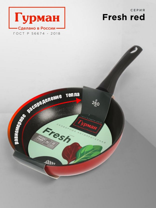 Сковорода литая алюминиевая 26 см Гурман Fresh red: антипригарное покрытие, подходит для индукции, идеальный выбор для кухни и дачи — готовьте легко и быстро.