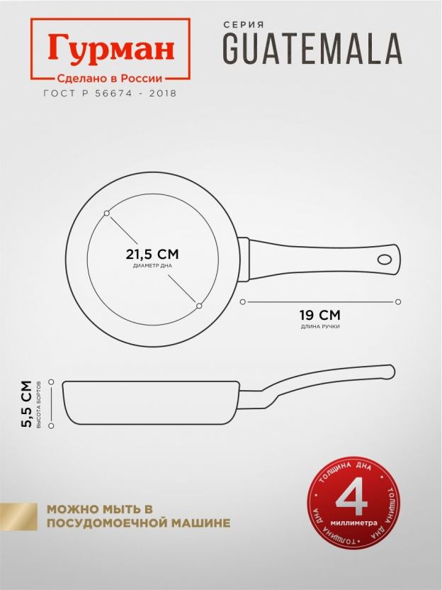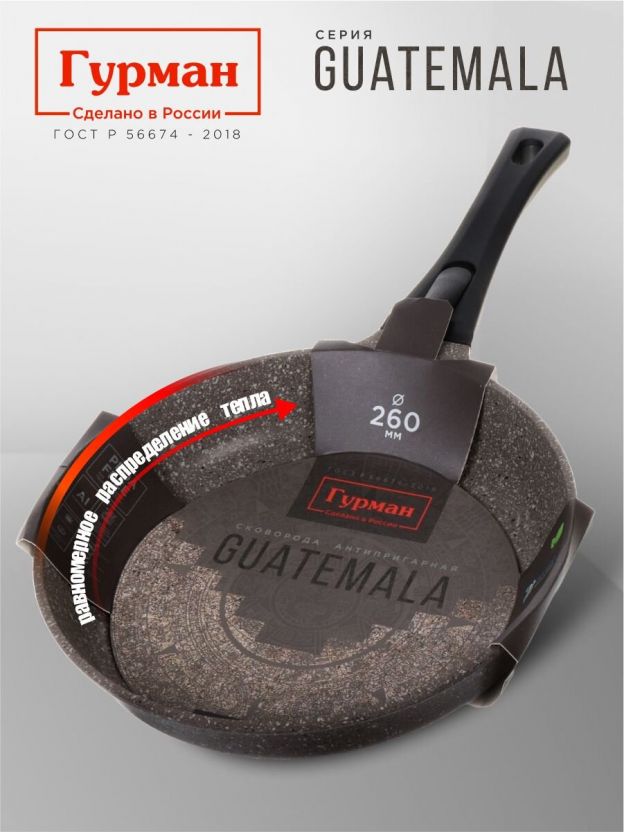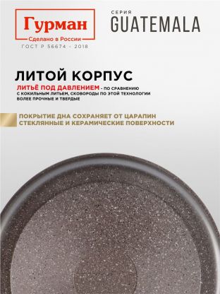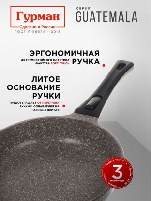 Подходит ли для индукционных плит? Эта сковорода рассчитана на газовые, электрические и стеклокерамические плиты, а также для духовки. Для индукции не подходит, что важно учитывать при выборе. Если вы ищете, какую сковороду купить недорого для дачи или дома — Guatemala от Гурман сочетает надежность, современный дизайн и практичность.