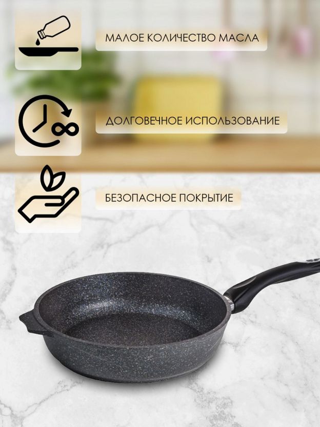 В отличие от аналогов с тонким дном, эта сковорода имеет 6-миллиметровое дно и 4-миллиметровые стенки, что обеспечивает долгий срок службы и устойчивость к деформации. Если вы спрашиваете, чем отличается гранитное покрытие от обычного тефлона, — гранитное дольше сохраняет свои свойства и не боится частого мытья в посудомоечной машине. Как использовать такую сковороду? Просто: готовьте любимые блюда без риска прилипания, экономьте время на уходе и наслаждайтесь вкусом без лишнего жира.