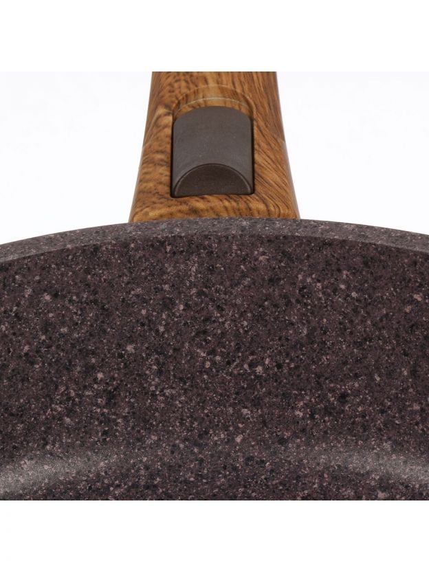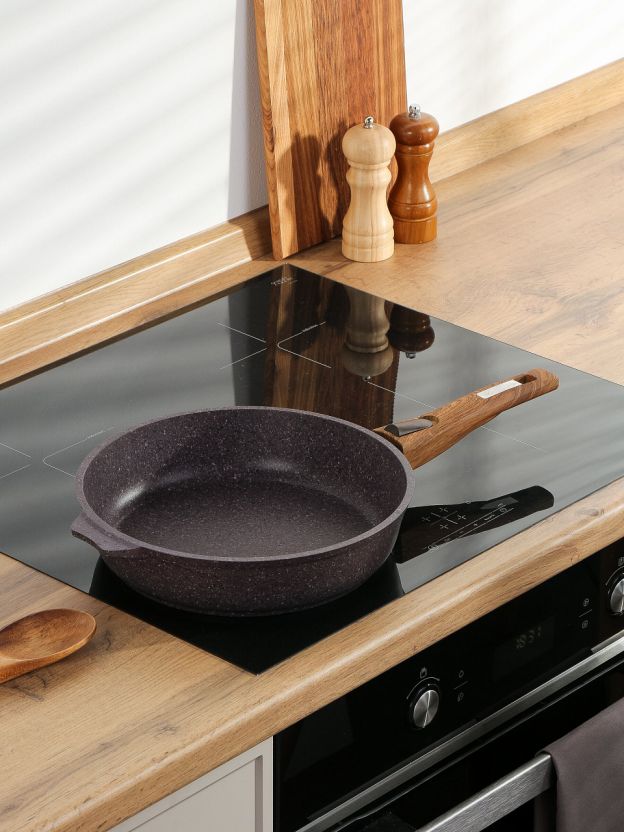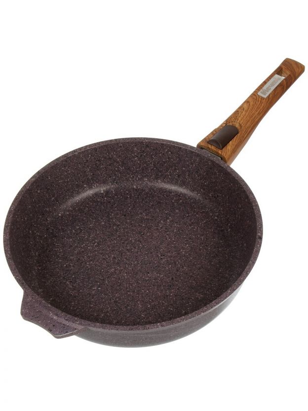 Диаметр 26 см, материал — литой алюминий, вес около 1,2 кг. Глубина оптимальна для жарки и тушения, съемная ручка облегчает хранение.