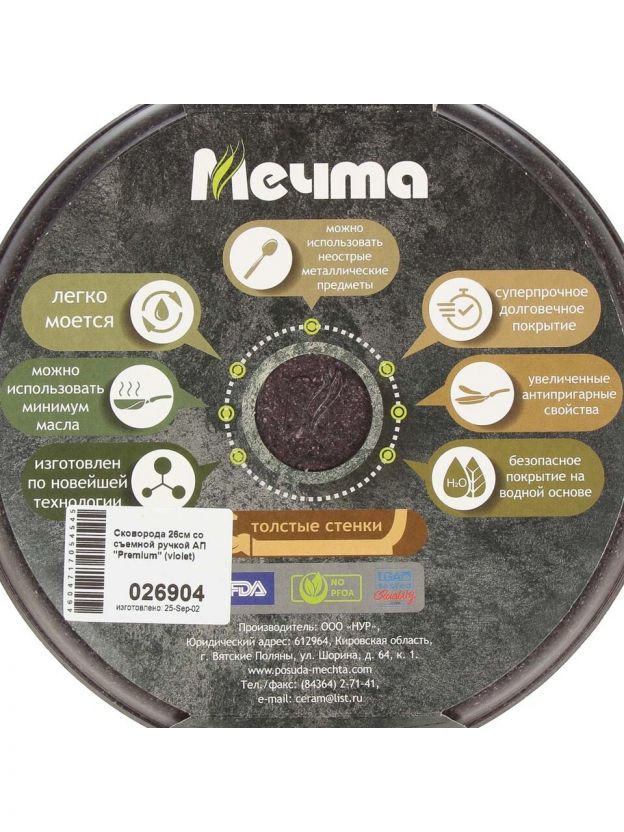 Сковорода литой алюминий, 26 см, антипригарное покрытие, Мечта, Premium violet, съемная ручка, 026904