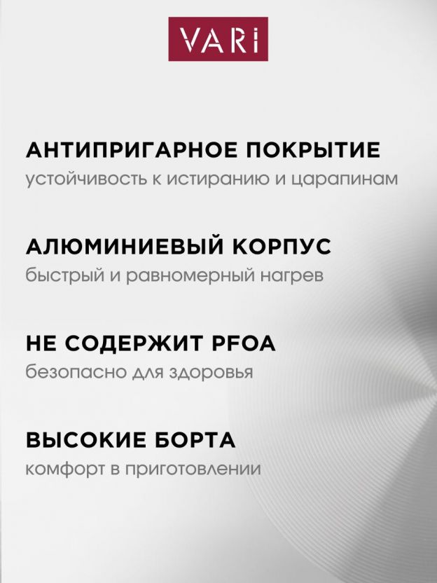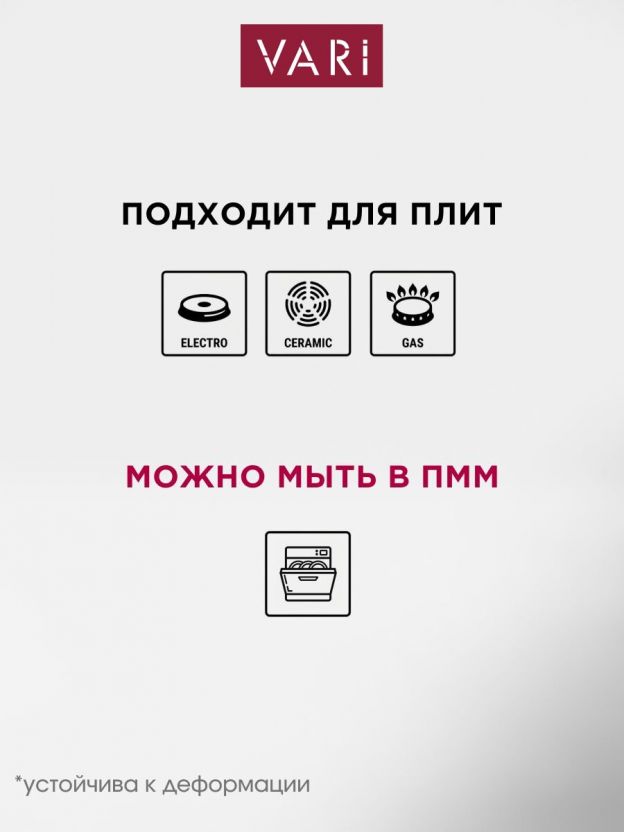 - Безопасное керамическое покрытие Vari — готовьте без масла, еда не прилипает, легко мыть в посудомоечной машине