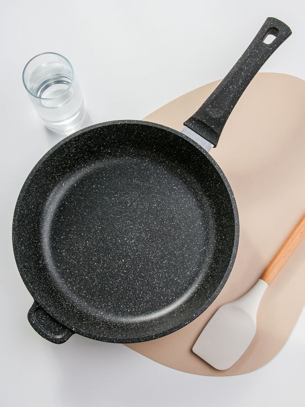 Сковорода Горница Гранит с антипригарным мраморным покрытием — оптимальный выбор для тех, кто ищет, какую сковороду купить для жарки без масла или для приготовления разных блюд. Литой алюминий обеспечивает равномерный нагрев по всей поверхности, а толщина дна 4 мм предотвращает деформацию и прилипание продуктов. Диаметр 28 см и высокая стенка (70 мм) позволяют готовить большие порции, что особенно удобно для семьи или гостей.