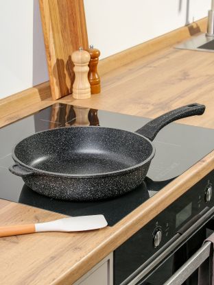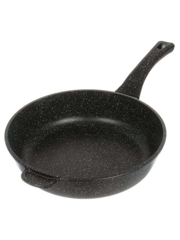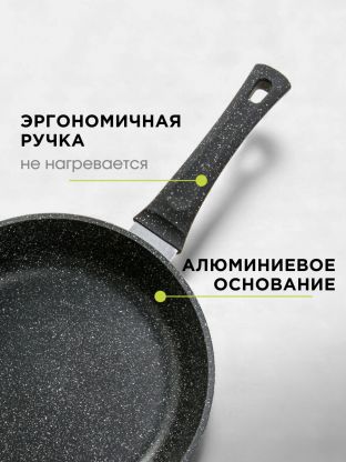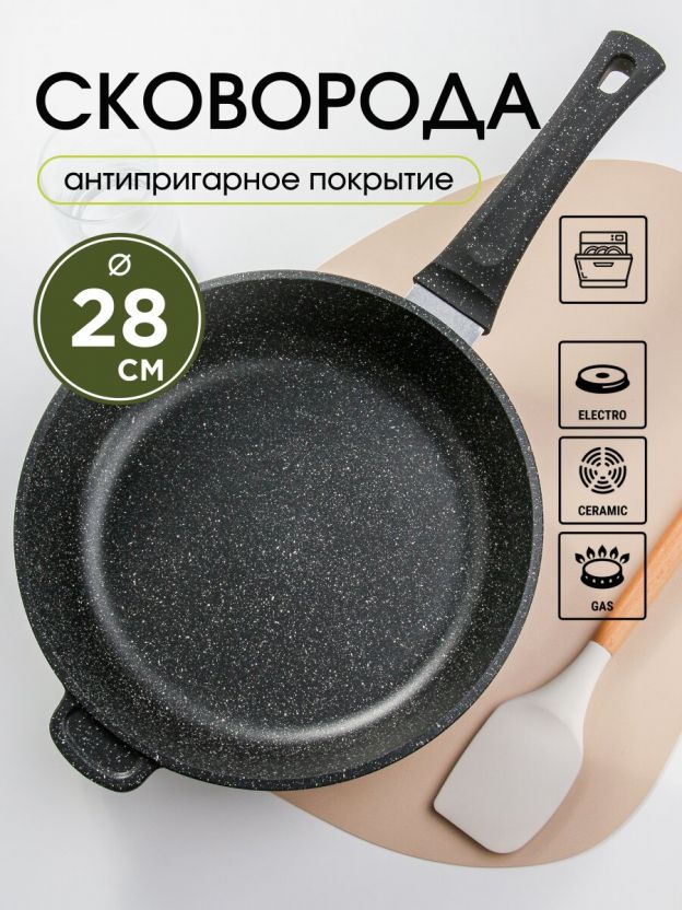 Сковорода Горница Гранит 28 см из литого алюминия: антипригарное мраморное покрытие, 60 месяцев гарантии, идеальна для жарки без масла и легкой чистки.