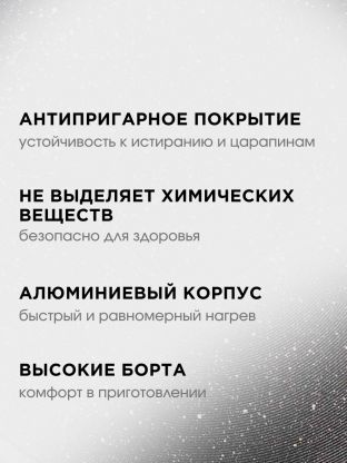 • Литой алюминий, диаметр 28 см, толщина дна 4 мм — равномерный прогрев, долговечность, вес 1,4 кг;