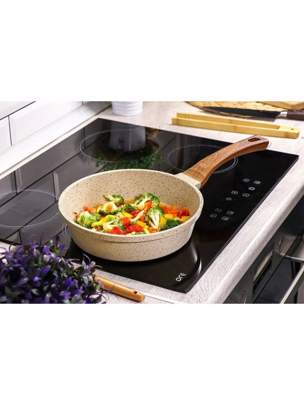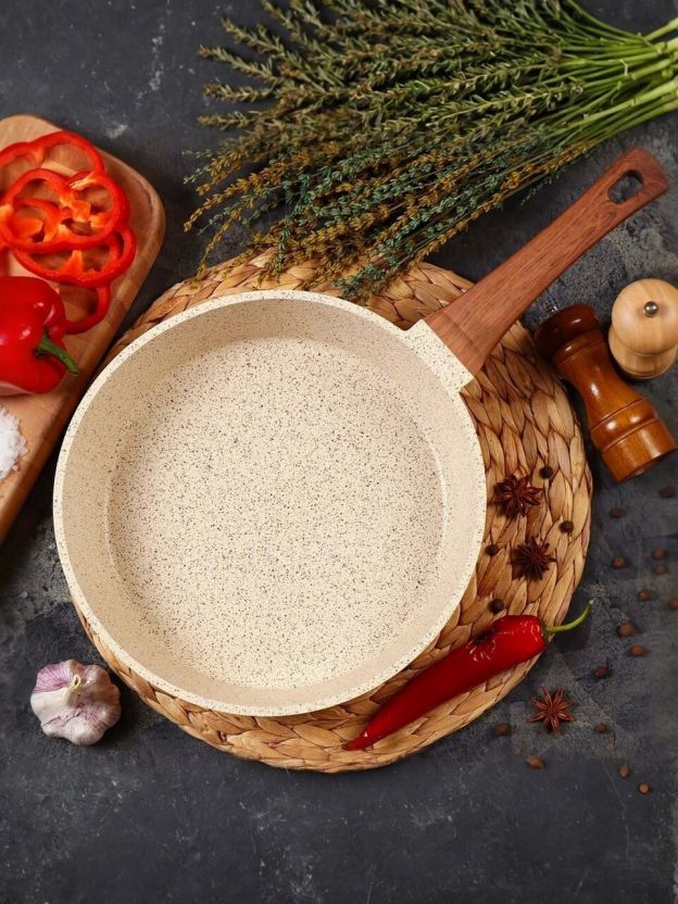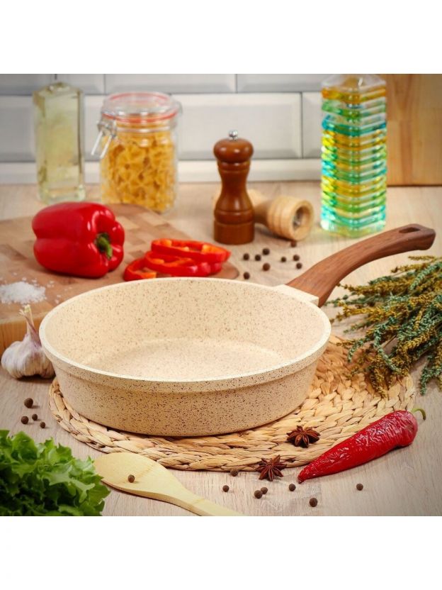 • Толстое дно 4 мм и литой алюминий — равномерный нагрев, диаметр 28 см, вес 1,35 кг, гарантия 36 месяцев