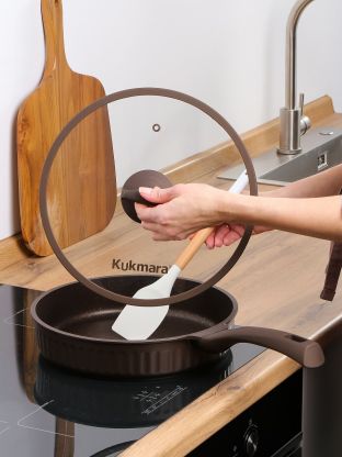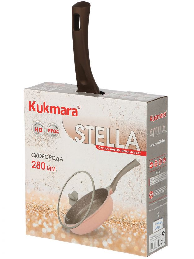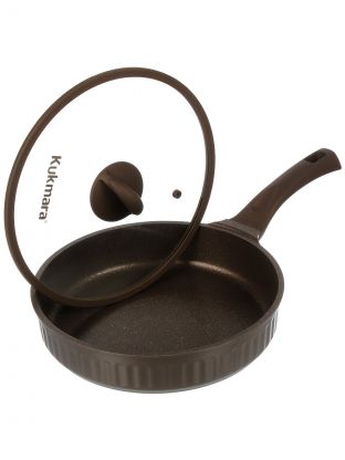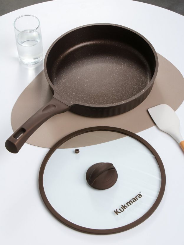 Литая сковорода Kukmara Stella 28 см с антипригарным гранитным покрытием и стеклянной крышкой: готовьте мясо, рыбу и оладьи без пригорания, легко мойте в посудомоечной машине.