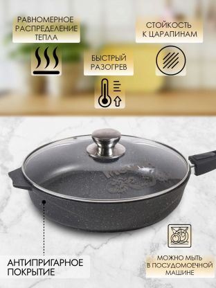 Сковорода Мечта Гранит black 28 см: литой алюминий, антипригарное покрытие, крышка и съемная ручка — решение для вкусных и здоровых блюд без пригорания.