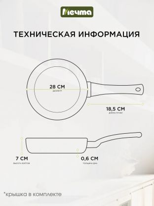 • Толстое дно 6 мм и литой алюминий — равномерный нагрев, долговечность, диаметр 28 см для семьи