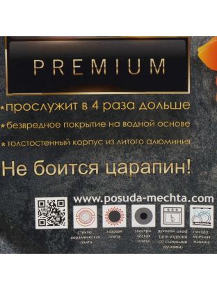 - Уникальное антипригарное покрытие «каменного» типа — еда не пригорает, легко мыть, долговечность до 12 месяцев гарантии