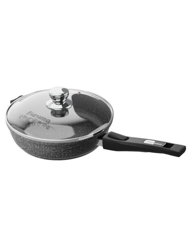 В отличие от обычных тонкостенных сковород, литой алюминий не деформируется со временем и устойчив к сколам. Съемная ручка и крышка позволяют использовать сковороду в духовке и экономить место на кухне. Если вы ищете, какую сковороду купить недорого для дачи или подарка, обратите внимание на модель «Мечта Гранит black»: она не подходит для индукции, зато совместима с газовыми, электрическими, стеклокерамическими и галогеновыми плитами. Подходит для жарки, тушения, запекания, приготовления омлетов и оладий.
