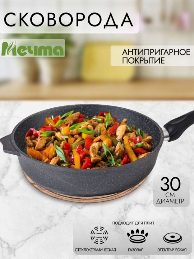 Закажите сковороду Мечта Гранит 30 см по выгодной цене — получите надежную посуду с гарантией 12 месяцев и быстрой доставкой. Качество подтверждено опытом покупателей!