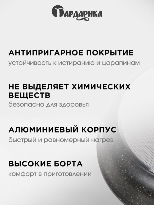 Гранитное покрытие устойчиво к царапинам, легко очищается, позволяет готовить без масла и не впитывает запахи. Это удобно для ежедневного использования и экономит время на уходе.
