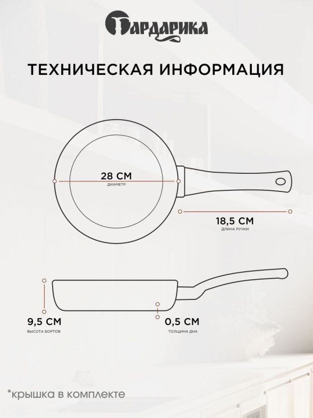 Диаметр 28 см, диаметр дна 14,5 см, высота борта 95 мм, толщина дна 5 мм, толщина стенок 3,5 мм. Съемная ручка и крышка в комплекте, форма круглая, материал — литой алюминий.